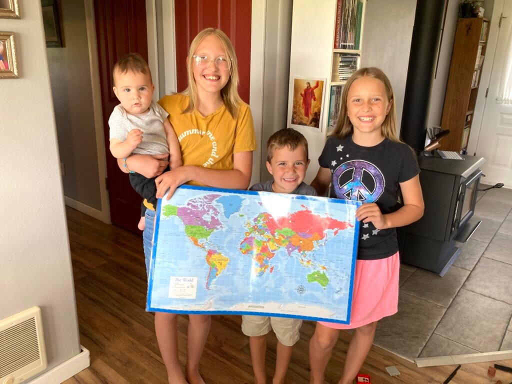 Little gold dot stickers were placed on the world map we hung in the hallway. What a great visual geography lesson!